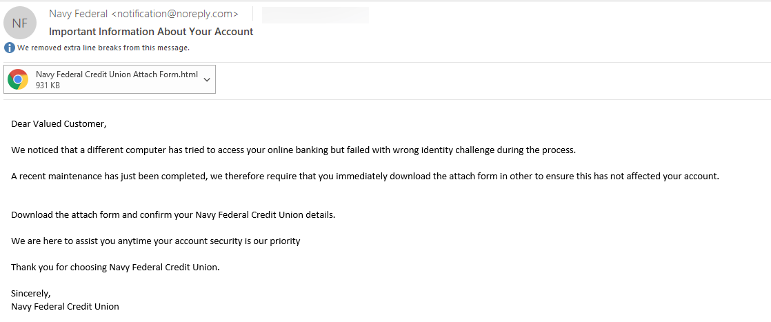 Navy Federal Credit Union (NFCU) – Phishing Email